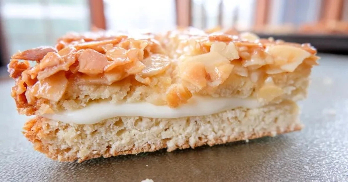 3️⃣ Teig backen: Den Teig auf ein gefettetes Backblech oder in eine Springform legen und gleichmäßig ausrollen. Den Mandelbelag darauf verteilen. Im vorgeheizten Ofen bei 180 °C (Ober-/Unterhitze) etwa 25–30 Minuten backen, bis der Belag goldbraun ist. Anschließend vollständig auskühlen lassen.