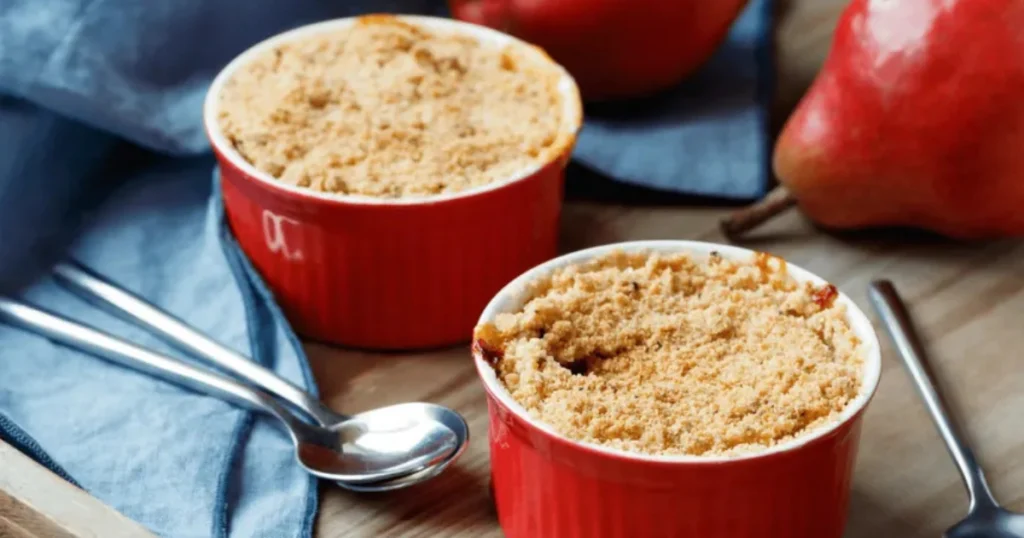 - Veganer Birnen-Crumble: Verwende pflanzliche Butter und einen pflanzlichen Sรผรstoff wie Ahornsirup.