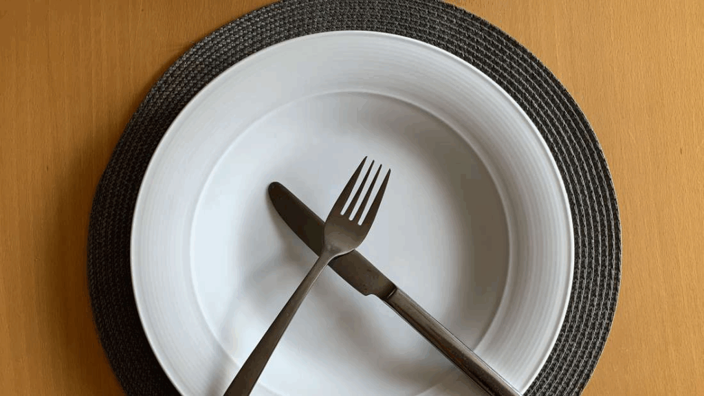 Legen Sie Messer und Gabel so ab, dass sie ein umgekehrtes Dreieck bilden, mit den Griffen am Tellerrand und den Spitzen zur Mitte – das bedeutet: Ich mache nur eine kurze Pause.