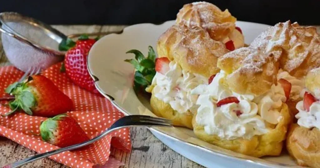 Windbeutel, auch bekannt als “Profiteroles” oder “Choux”, sind ein wahrer Klassiker der französischen Backkunst. Diese kleinen, leichten Teigbällchen sind außen knusprig und innen luftig. Sie können mit einer Vielzahl von Füllungen wie Vanillecreme, Schlagsahne oder Eis serviert werden und sind ein beliebtes Dessert für festliche Anlässe oder Kaffeetafeln.